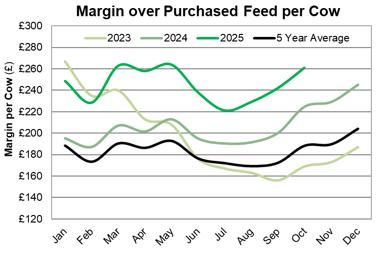 Milk from forage averaged 7.7 litres/cow/day, an 18% increase compared with October 2024. The prolonged dry weather and lack of grass growth meant many farmers had to feed more concentrates to maintain production. This additional input contributed to higher overall milk yields, which rose by 8% year-on-year to 28.2 litres/cow/day.