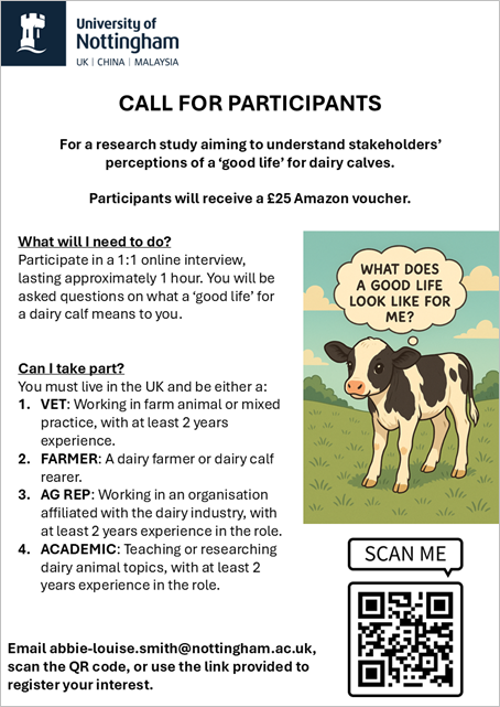 Abbie-Louise Smith, a PhD candidate at the University of Nottingham has asked if I can share this with you, she is looking for participants to take part in her study - The aim of the study is to better understand dairy industry stakeholders’ perceptions of a ‘good life’ and what this means for dairy calves. Your input into this study would be highly valued. Link to register: https://forms.office.com/e/wDYzNSDJfU.